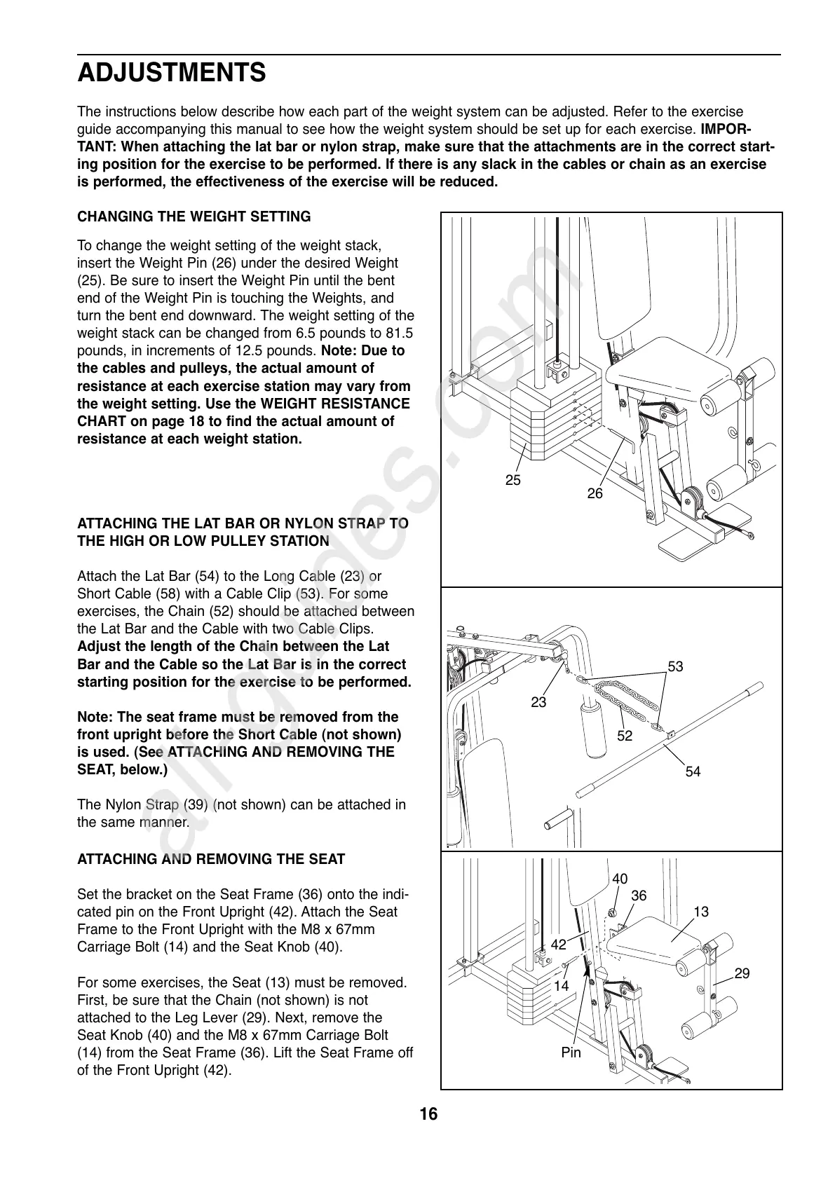 The instructions below describe how each part of the weight system can be adjusted. Refer to the exercise