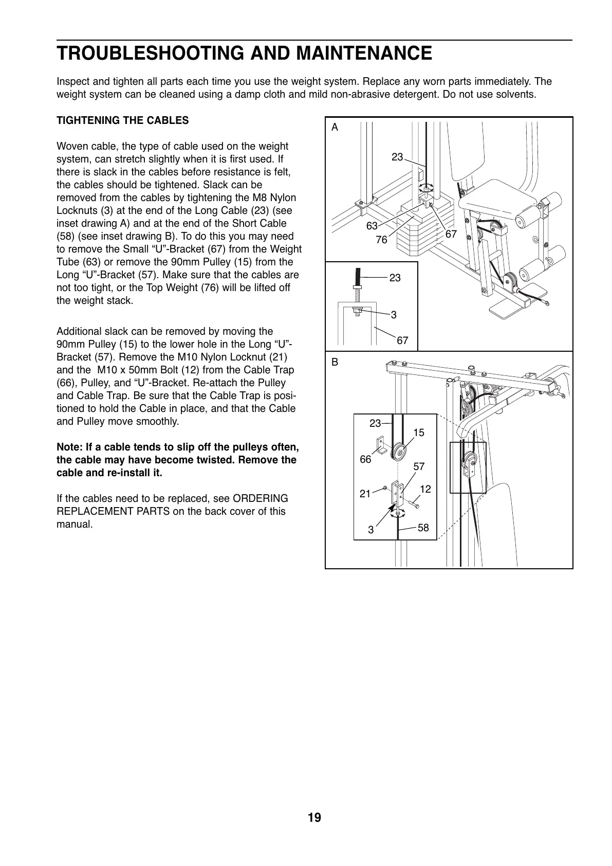 Inspect and tighten all parts each time you use the weight system. Replace any worn parts immediately. The