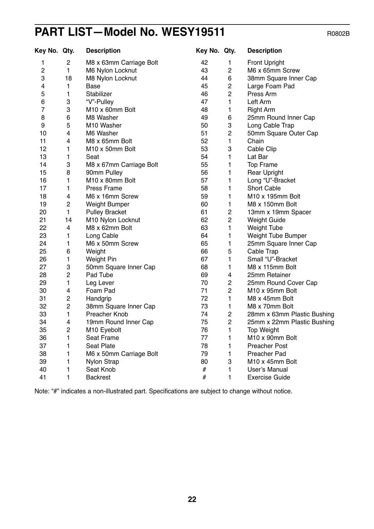 Note: “#” indicates a non-illustrated part. Specifications are subject to change without notice.