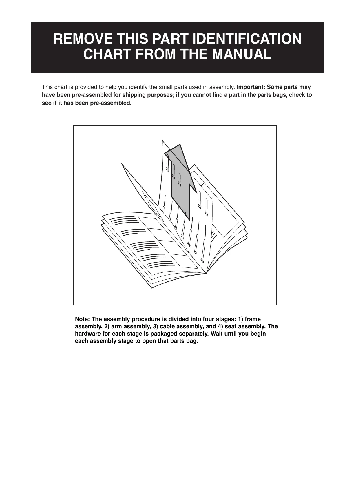 This chart is provided to help you identify the small parts used in assembly. Important: Some parts may