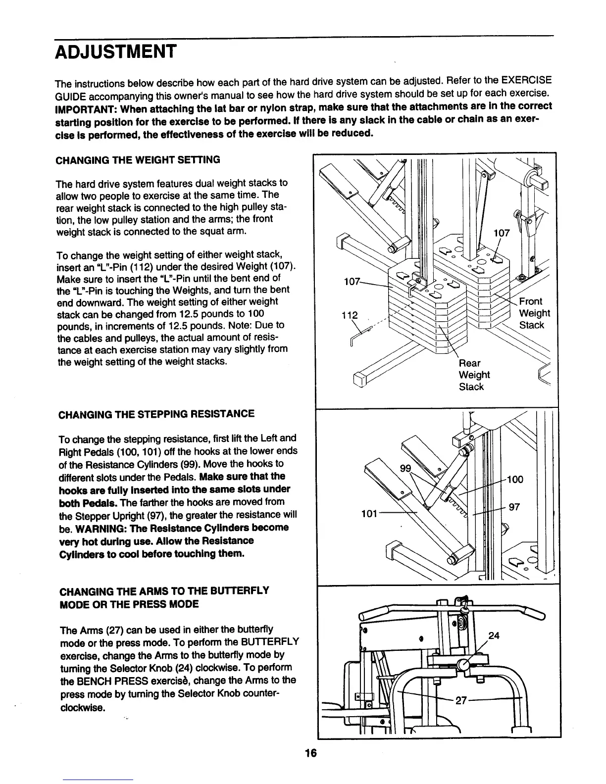 Weider 8650hard Drive Sys - Adjustment; Changing the Weight Setting; Changing the Stepping Resistance; Changing the Arms to the Butterfly Mode or the Press Mode