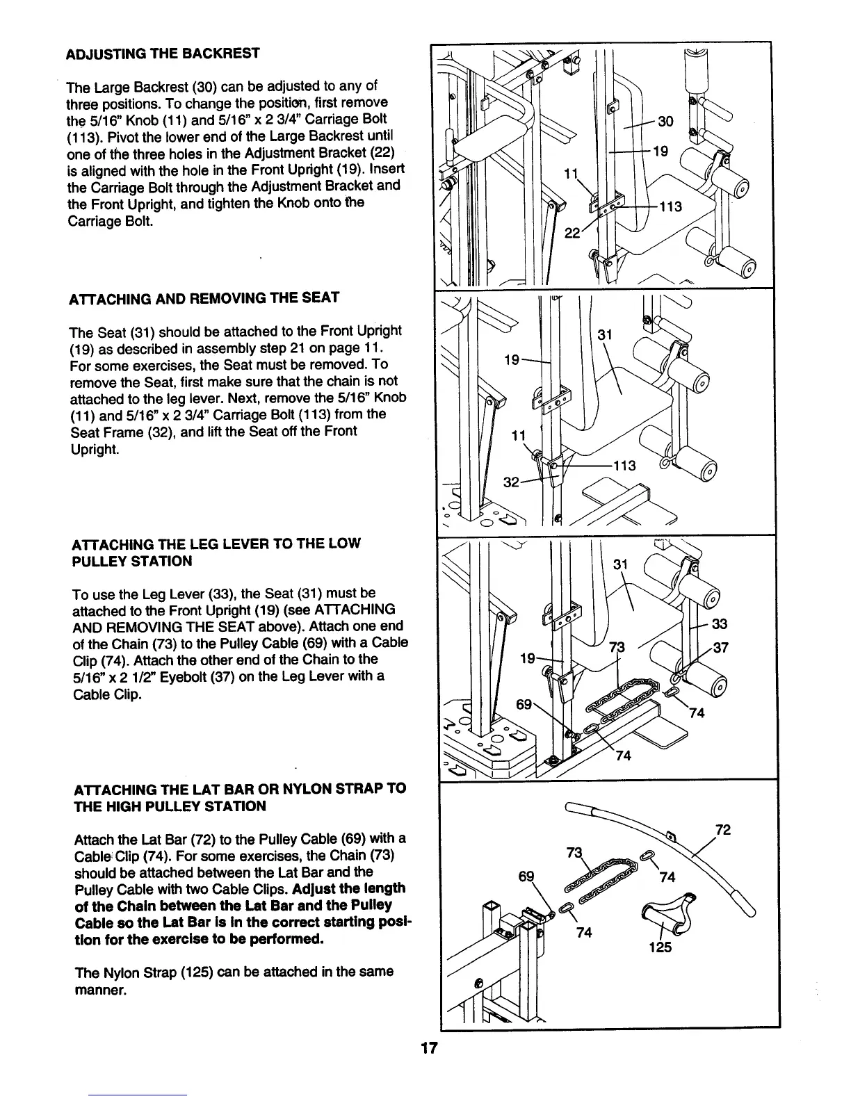Weider 8650hard Drive Sys - Adjusting the Backrest; Attaching and Removing the Seat; Attaching the Leg Lever to the Low Pulley Station; Attaching the Lat Bar or Nylon Strap to the High Pulley Station