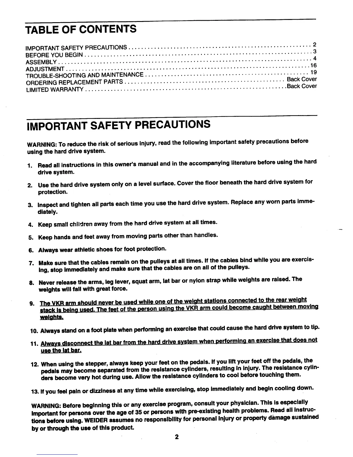 Weider 8650hard Drive Sys - Table of Contents; Safety Precautions