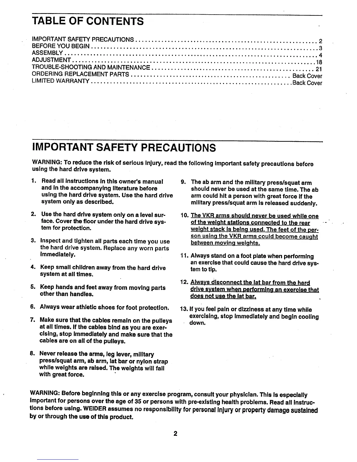 Weider 8775hard Drive Sys - Table of Contents; Important Safety Precautions