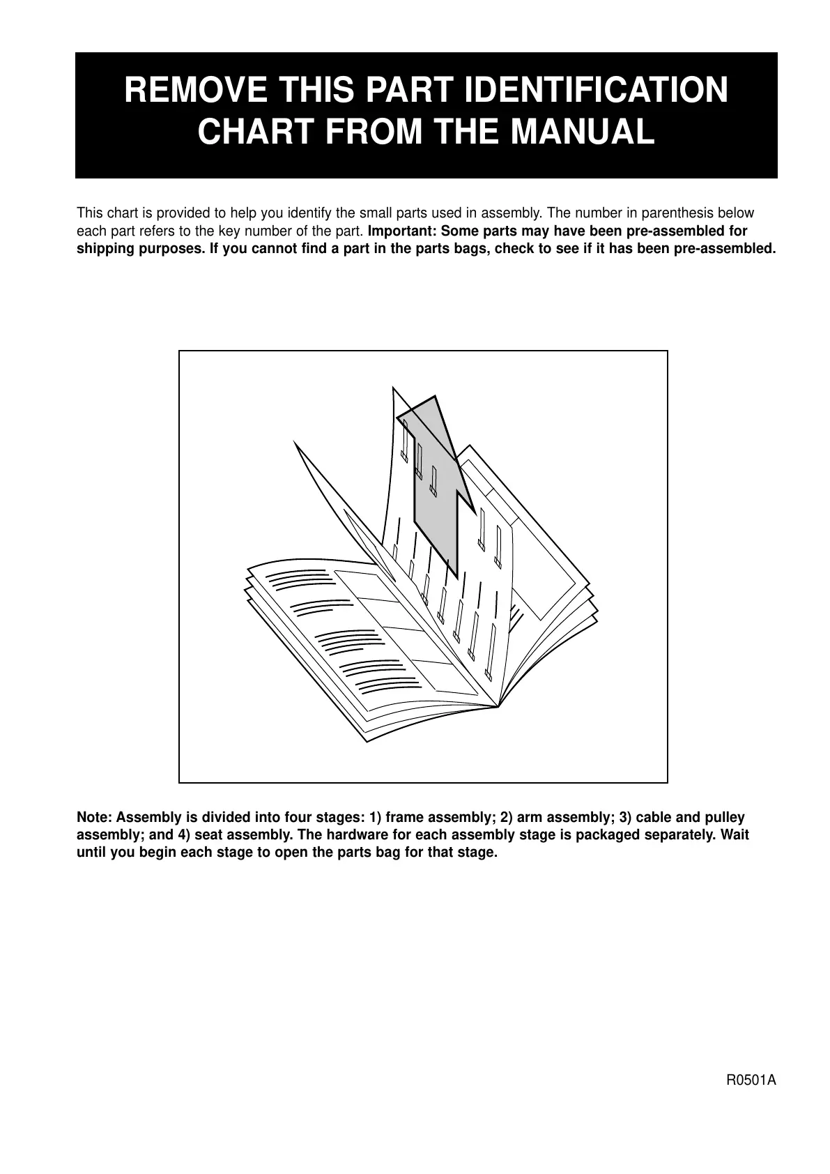 Note: Assembly is divided into four stages: 1) frame assembly; 2) arm assembly; 3) cable and pulley