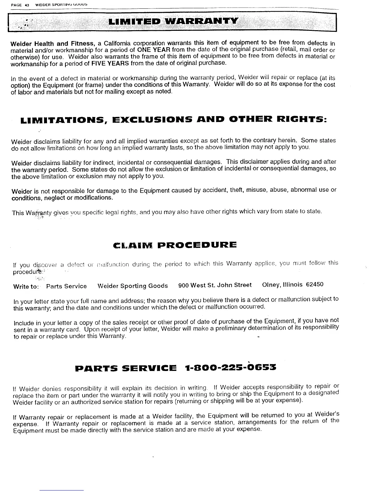Weider Body Blaster Force 4 - Limited Warranty Information; Claim Procedure and Contact Details