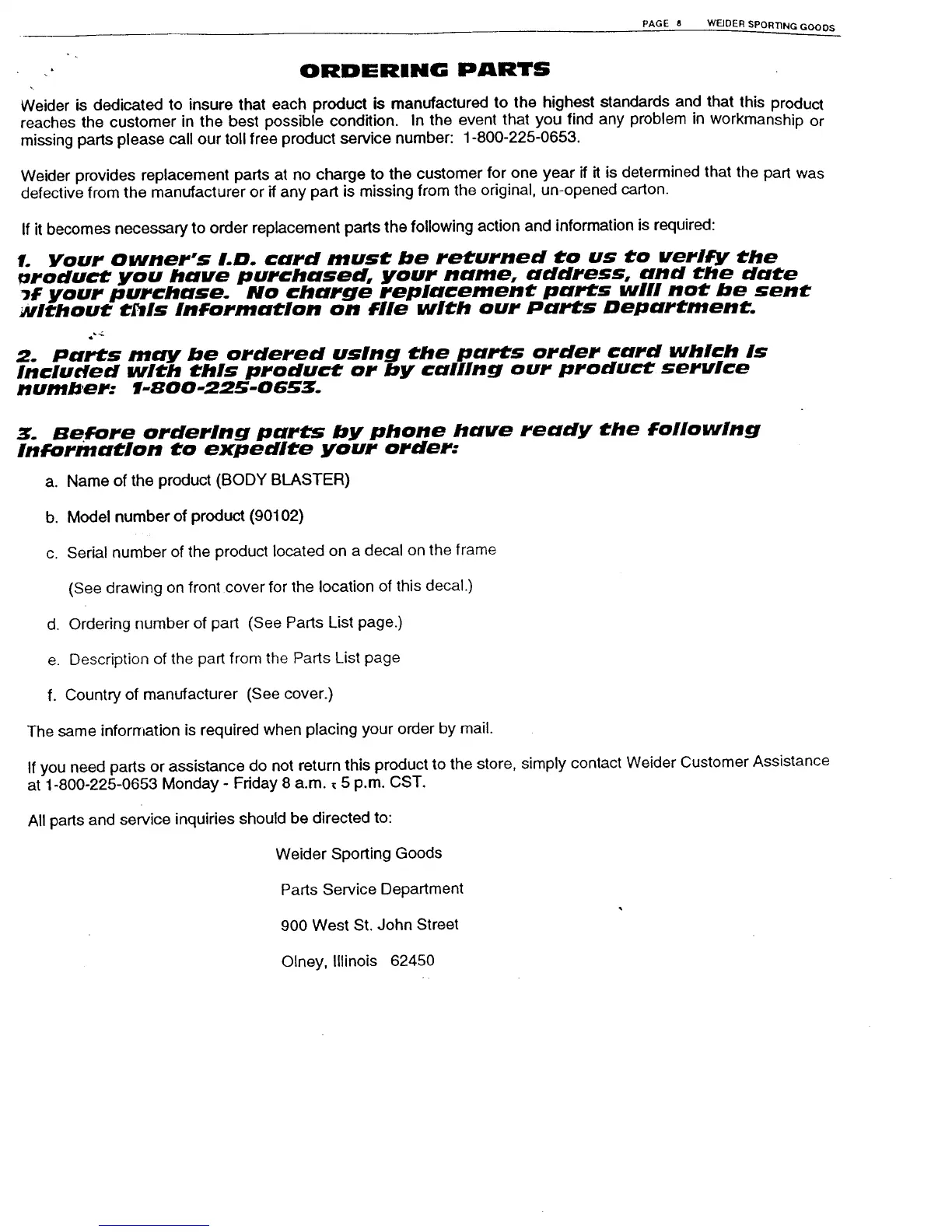 Weider Body Blaster Force 4 - How to Order Replacement Parts; Procedure for Obtaining Spare or Missing Components