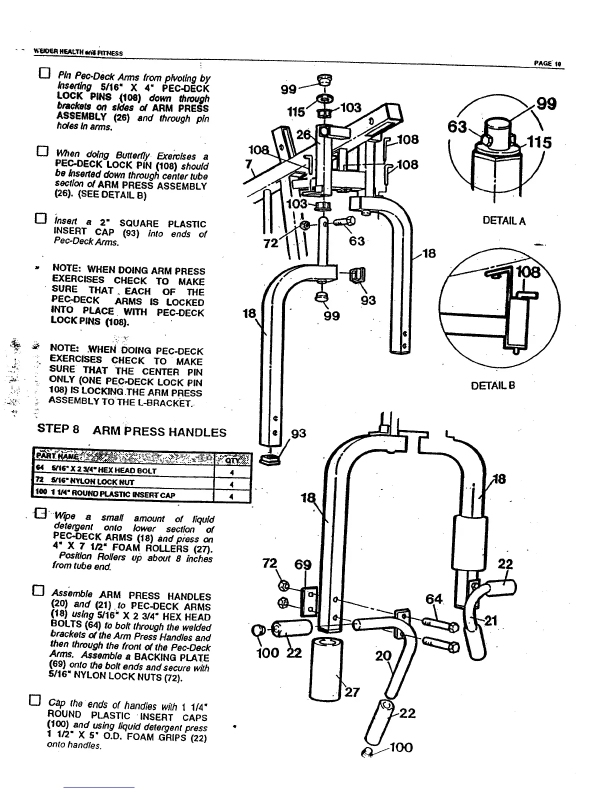 Weider E8000 - Step 8: Arm Press Handles Assembly; Pinning Pec-Deck Arms; Attaching Handles and Grips