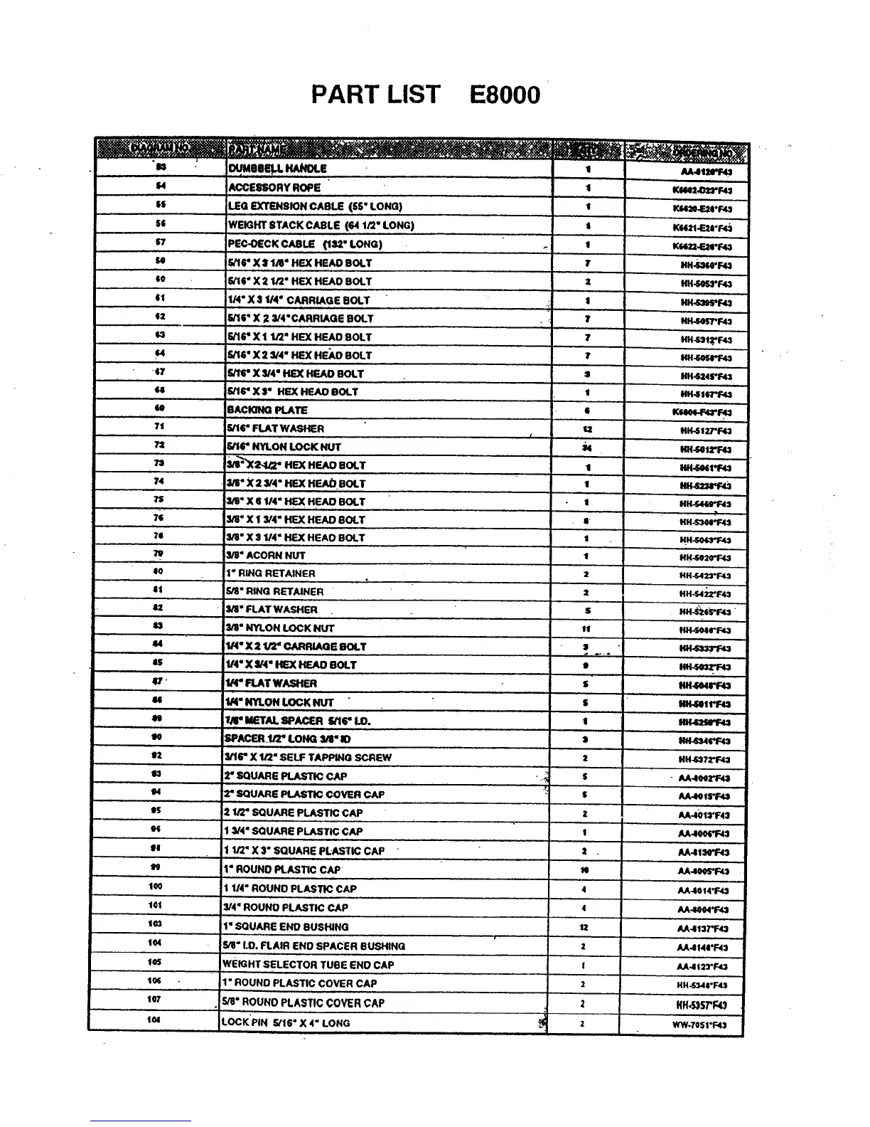Weider E8000 - Component Identification; Hardware, Fasteners, and Washers; Plastic Caps, Bushings, and Spacers; Cables, Retainers, and Pins