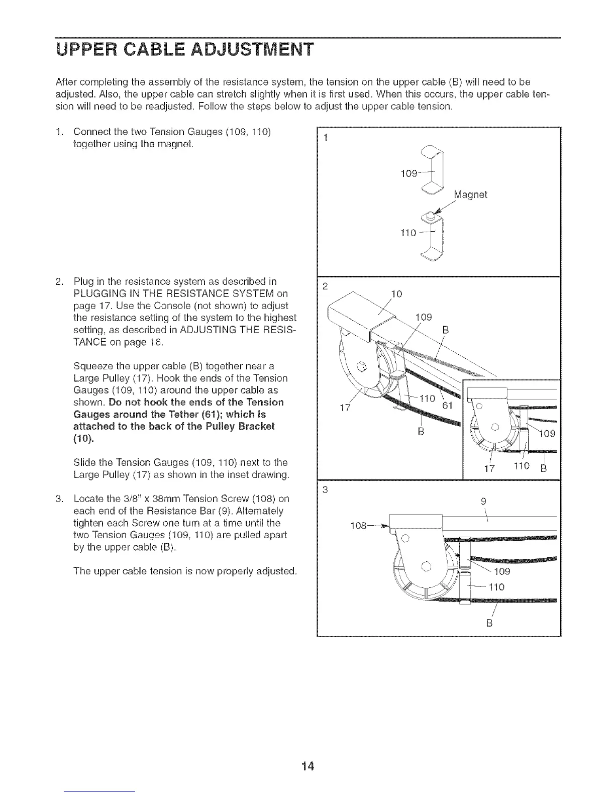 After completing the assembly of the resistance system, the tension on the upper cable (B) will need to be