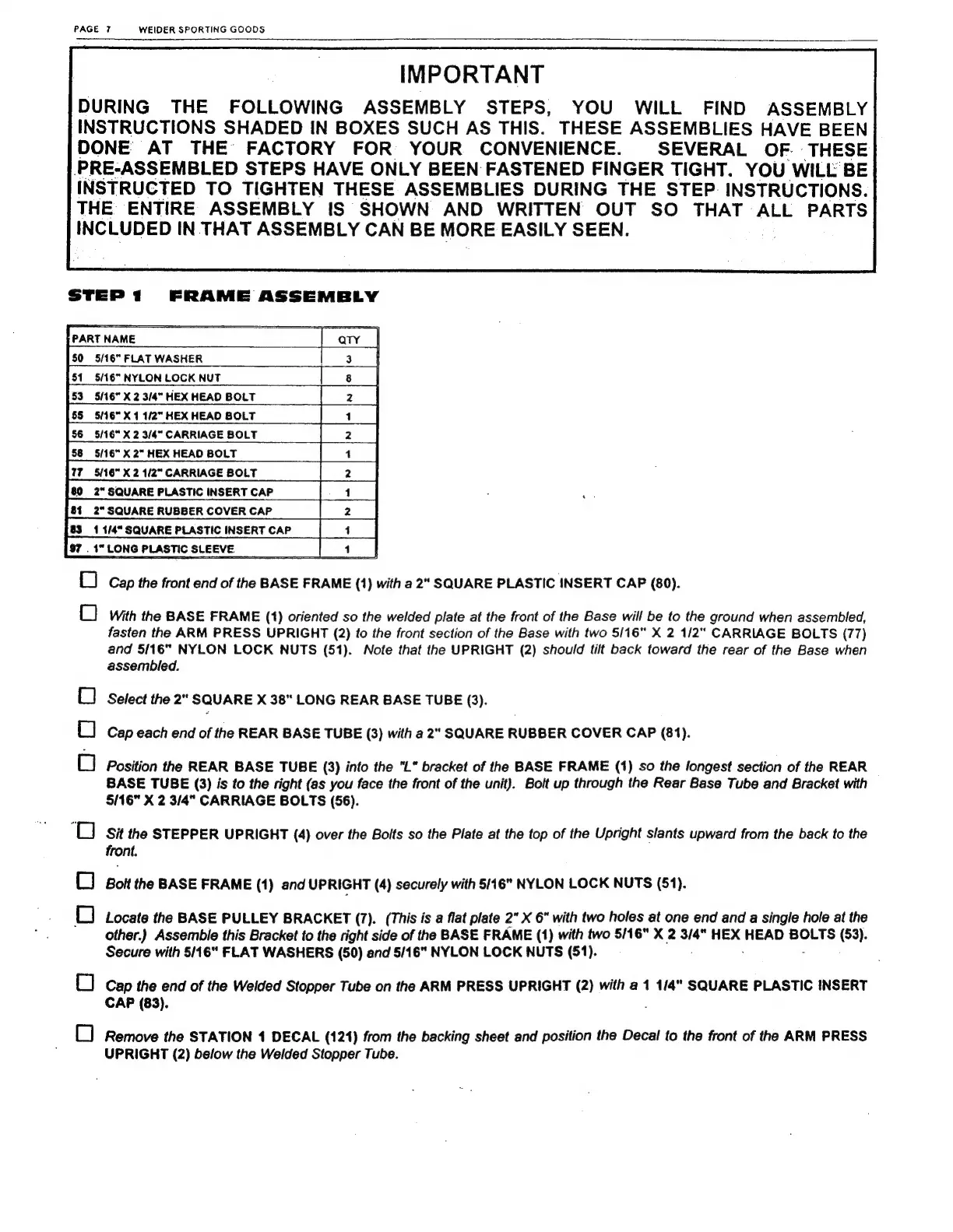 Weider Powermax 70072 - Assembly Instructions; Frame and Weight Stack Assembly