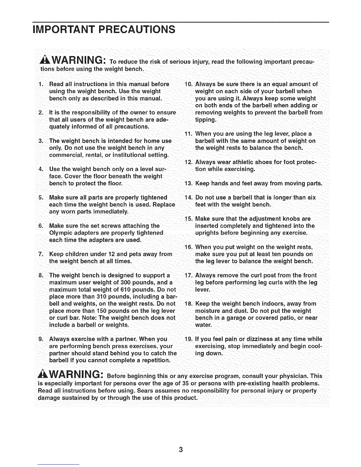 5. Make sure all parts are properly tightened 14. Do not use a barbell that is longer than six