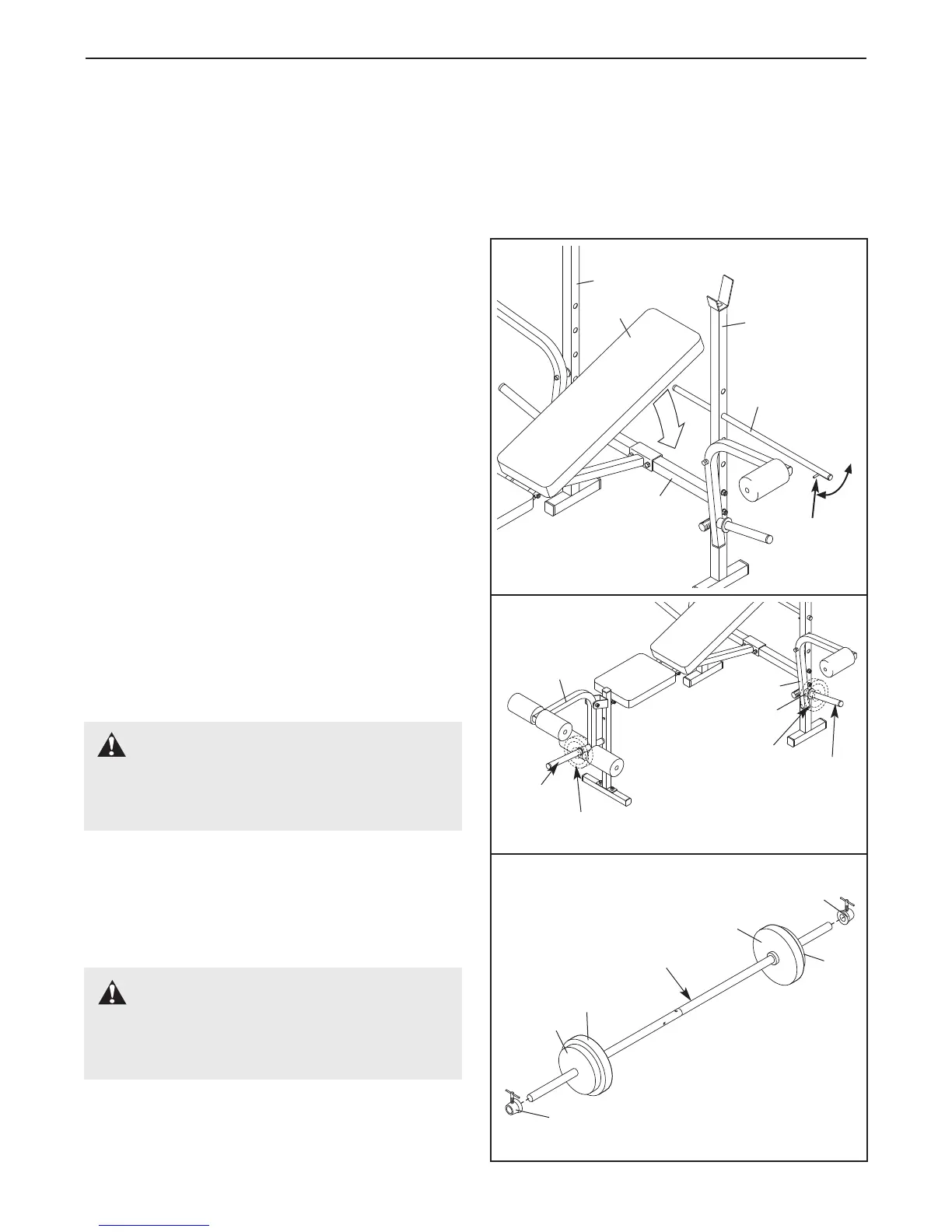 Make sure all parts are properly tightened each time the weight bench is used. Replace any worn parts immediately.