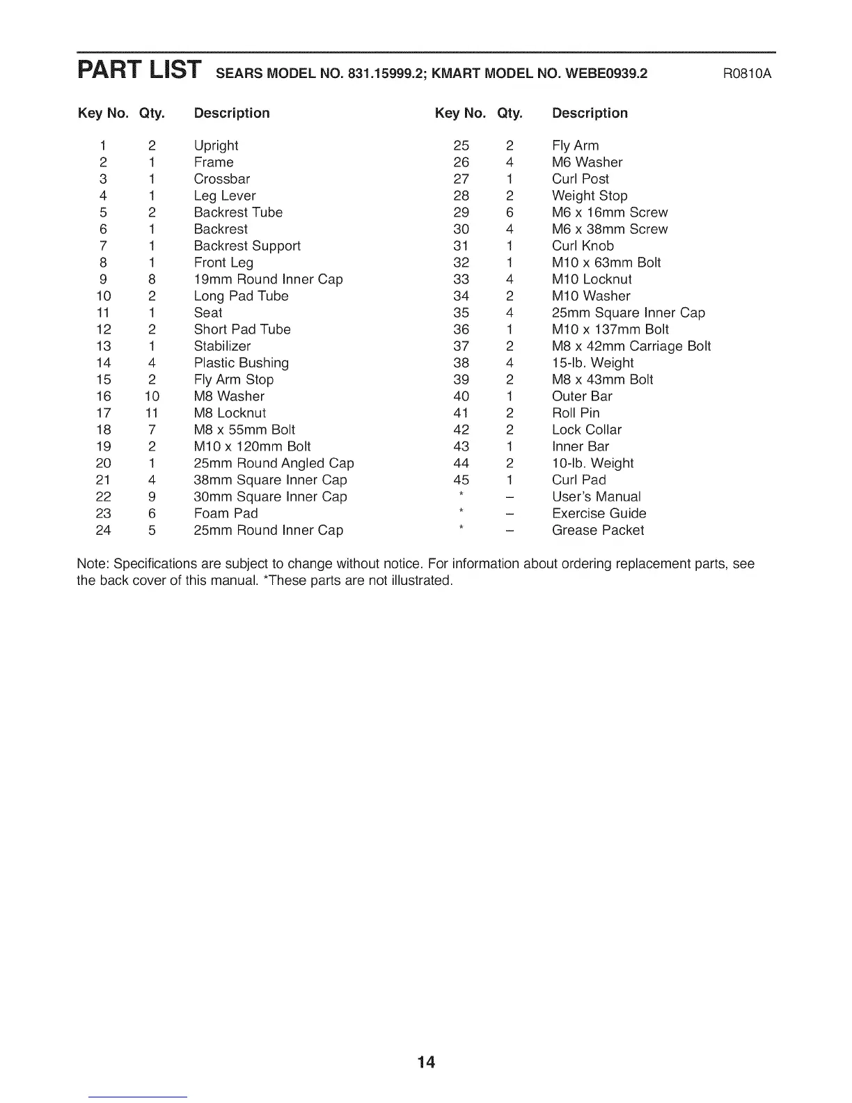 PART LiST SEARSMODELNO.831.1S999.2;KMARTMODELNO.WEBE0939.2 R0810A
