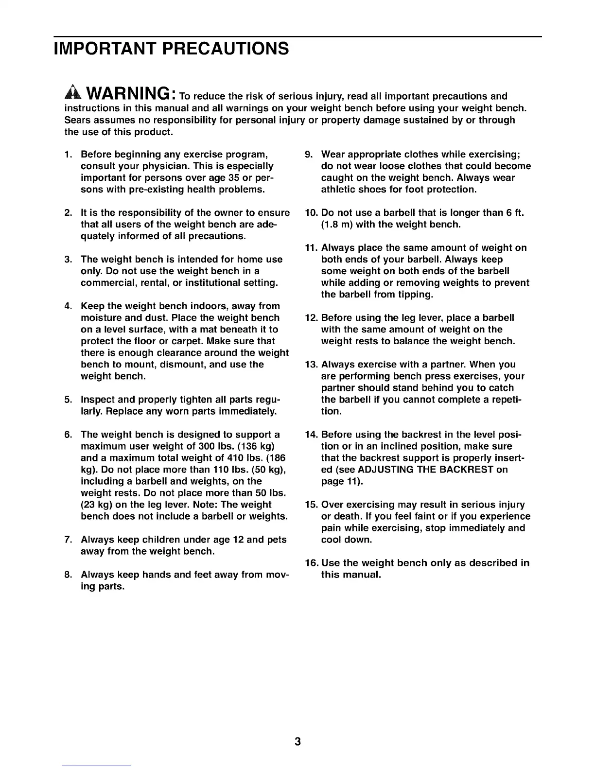 instructions in this manual and all warnings on your weight bench before using your weight bench.