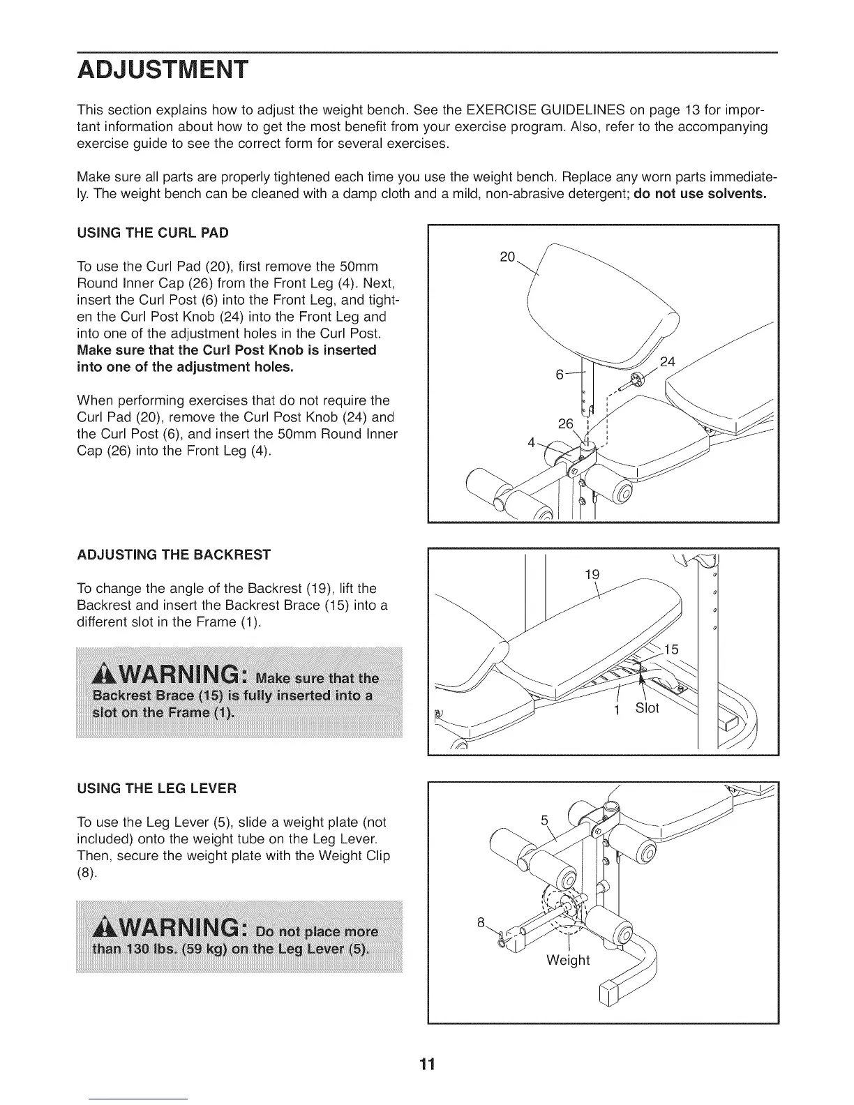 Make sure all parts are properly tightened each time you use the weight bench. Replace any worn parts immediate-