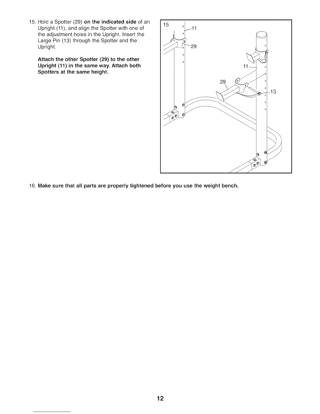 16. Make sure that all parts are properly tightened before you use the weight bench.