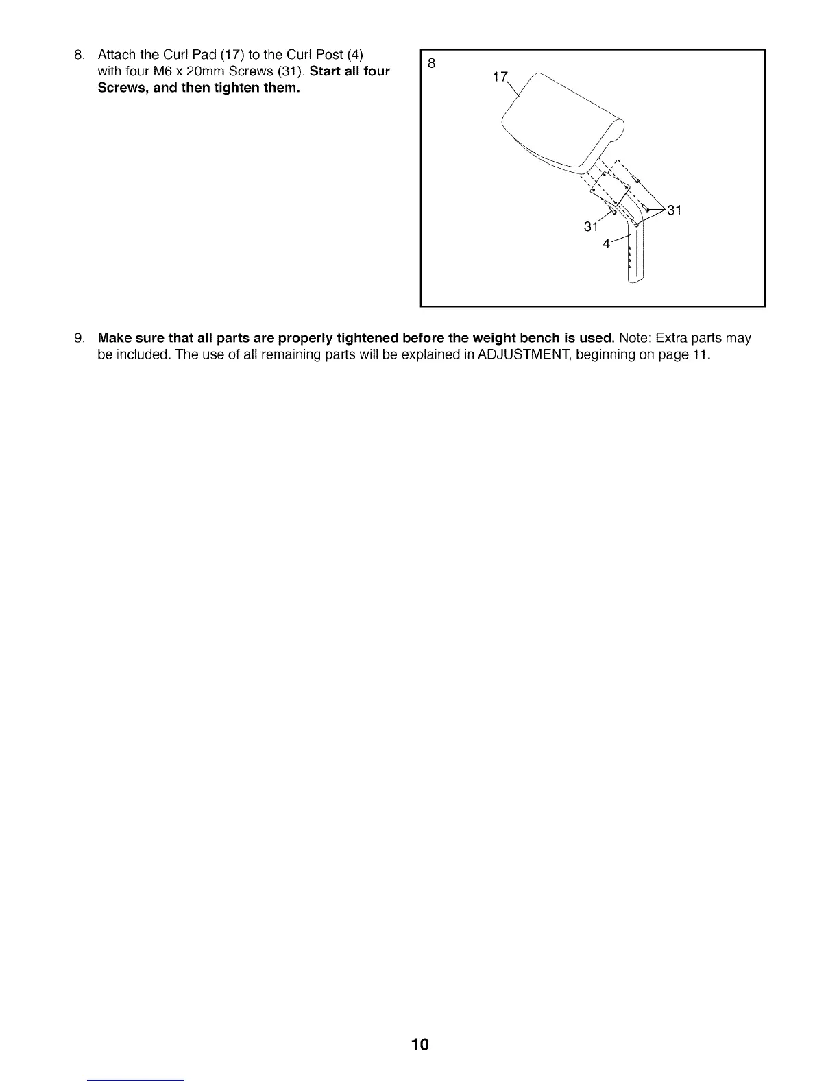 9. Make sure that all parts are properly tightened before the weight bench is used. Note: Extra parts may