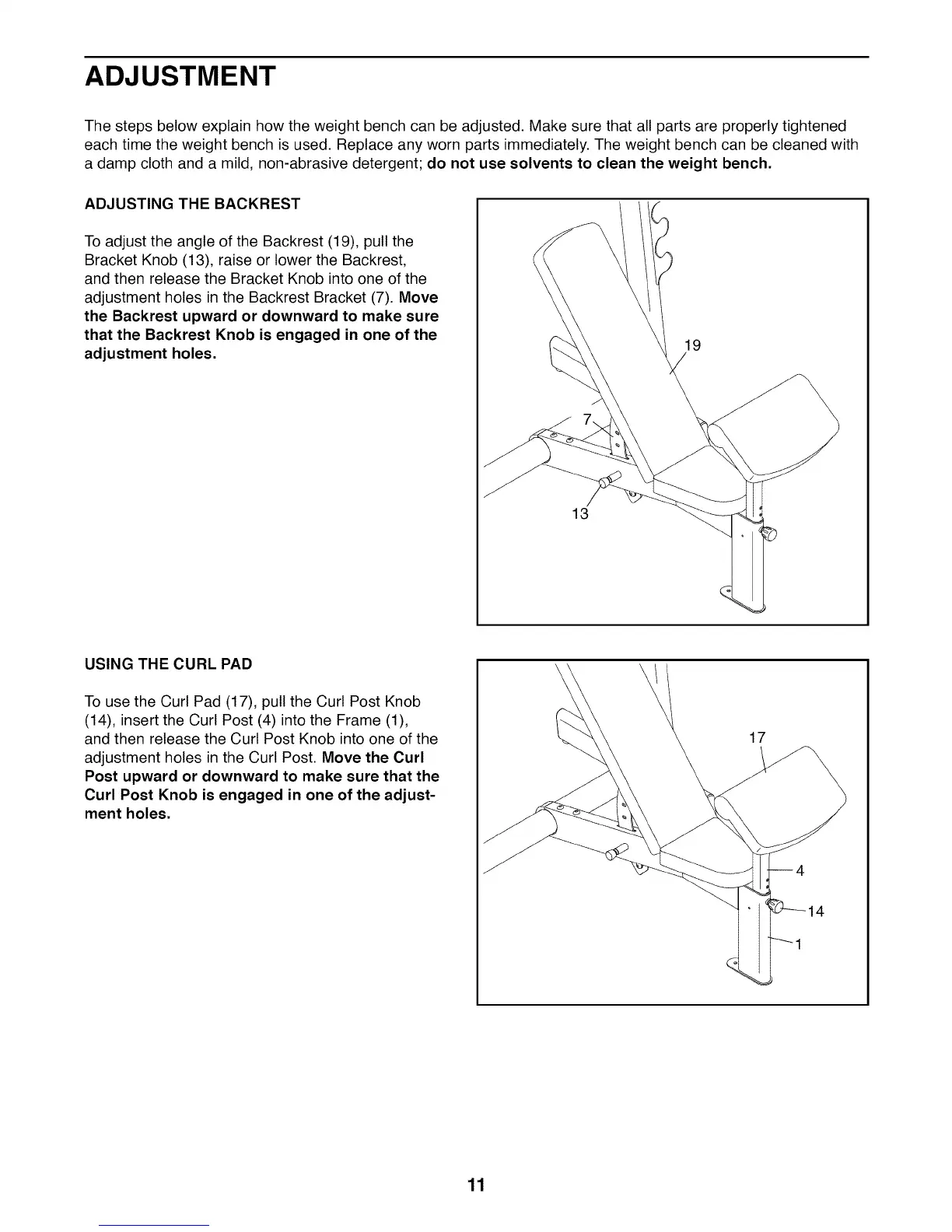 The steps below explain how the weight bench can be adjusted. Make sure that all parts are properly tightened