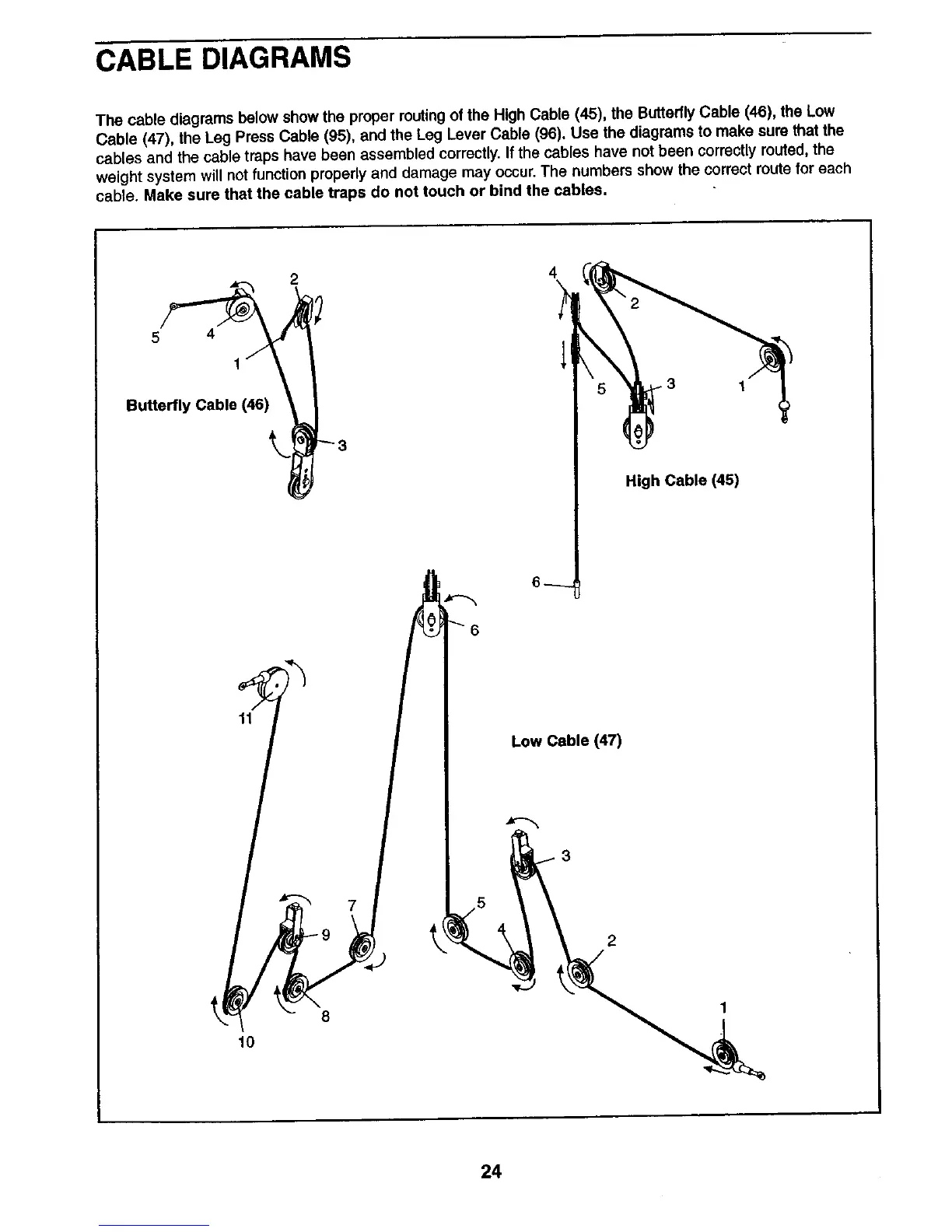 Cable (47), the Leg Press Cable (95), and the Leg Lever Cable (96). Use the diagrams to make sure that the