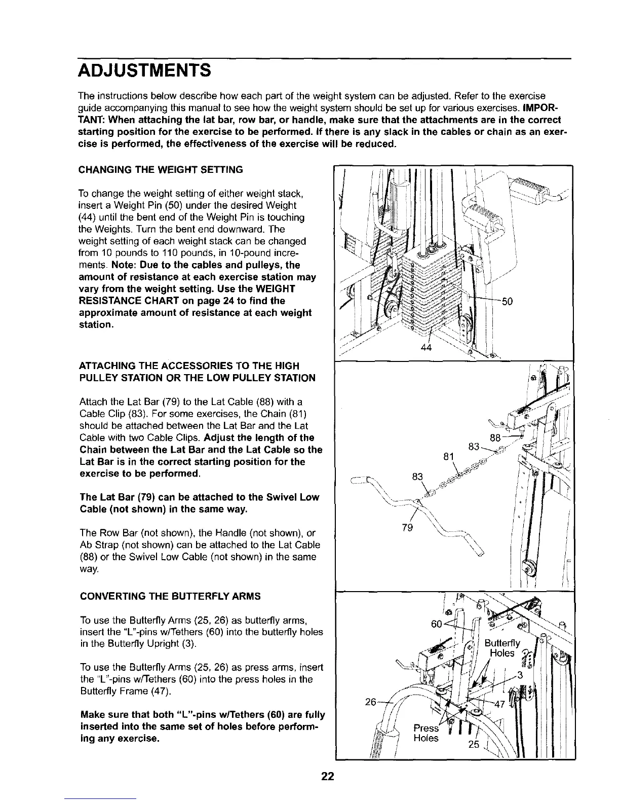 The instructions below describe how each part of the weight system can be adjusted. Refer to the exercise