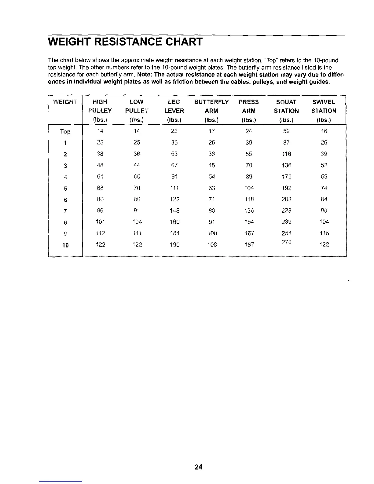resistance for each butterfly arm. Note: The actual resistance at each weight station may vary due to differ-