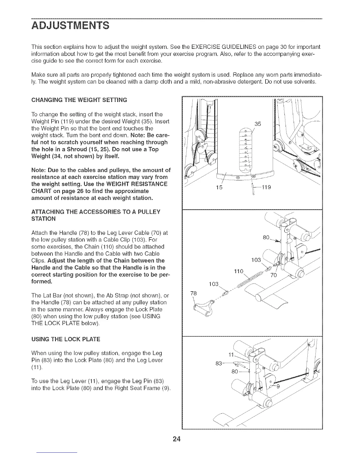 This section explains how to adjust the weight system, See the EXERCISE GUiDELiNES on page 30 for important