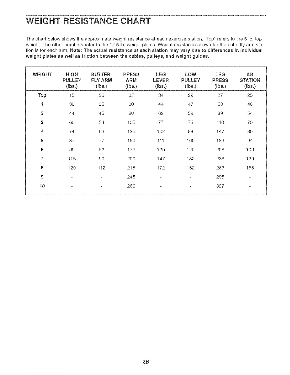 The chart beUowshows the approximate weight resistance at each exercise station, "Top" refers to the 6 Ub.top