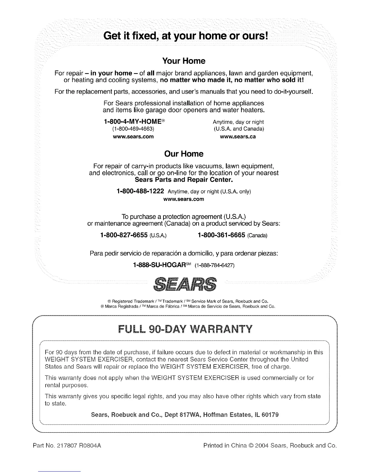 WEIGHT SYSTEM EXERCISER, contact the nearest Sears Service Center throughout the United
