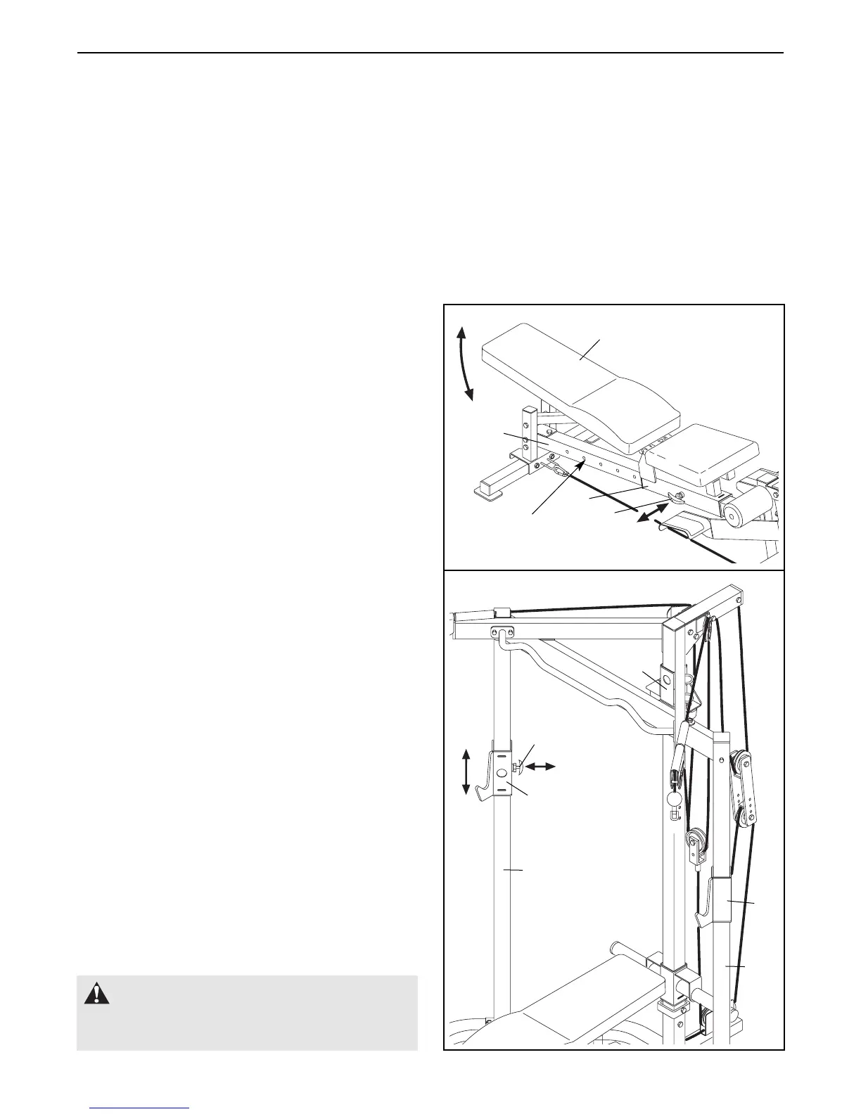 This section explains how to adjust the weight bench. The first time you perform an exercise that uses the safety