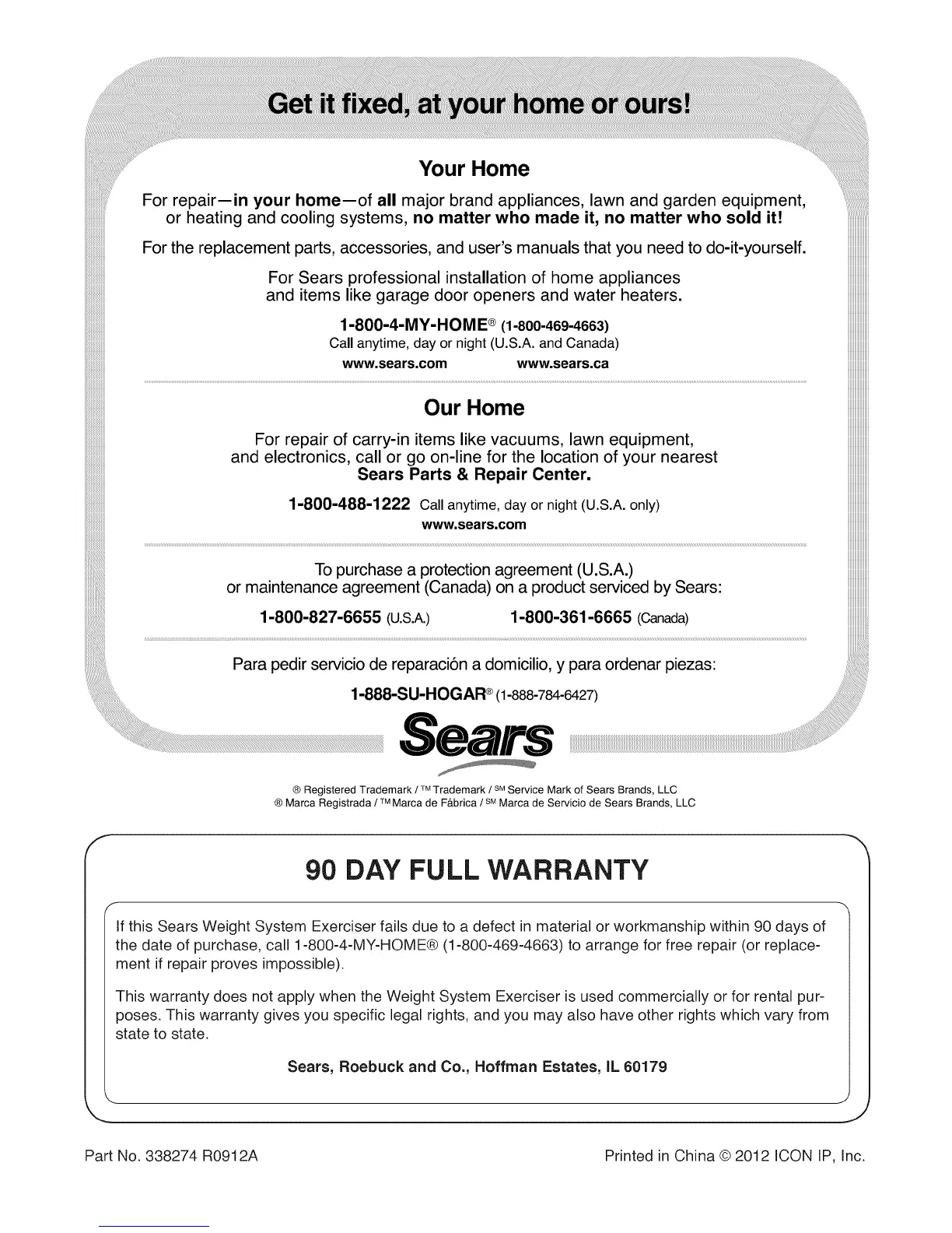 Part No. 338274 R0912A Printed in China © 2012 ICON IP, Inc.