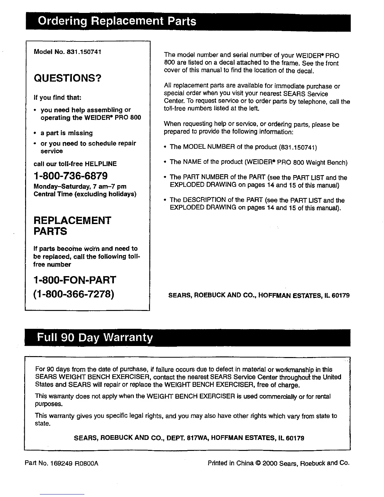 Part No. 169249 R0800A Printed in China © 2000 Sears, Roebuck and Co.