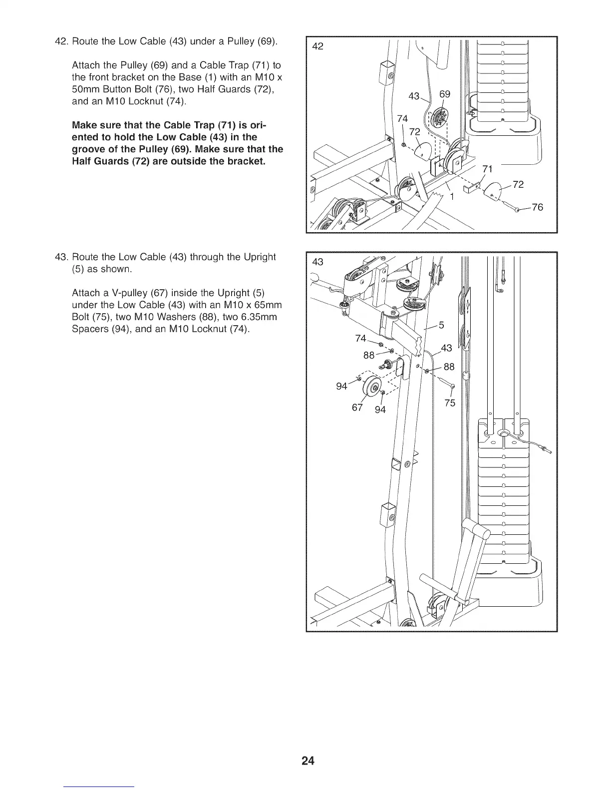 43. Route the Low Cable (43) through the Upright