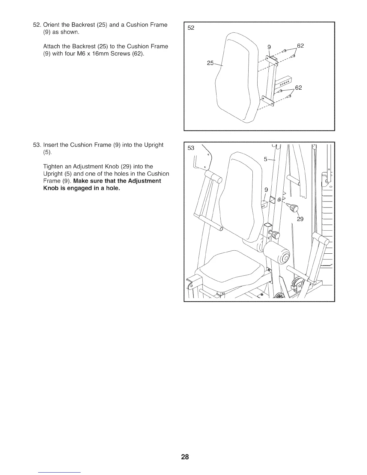 52. Orient the Backrest (25) and a Cushion Frame