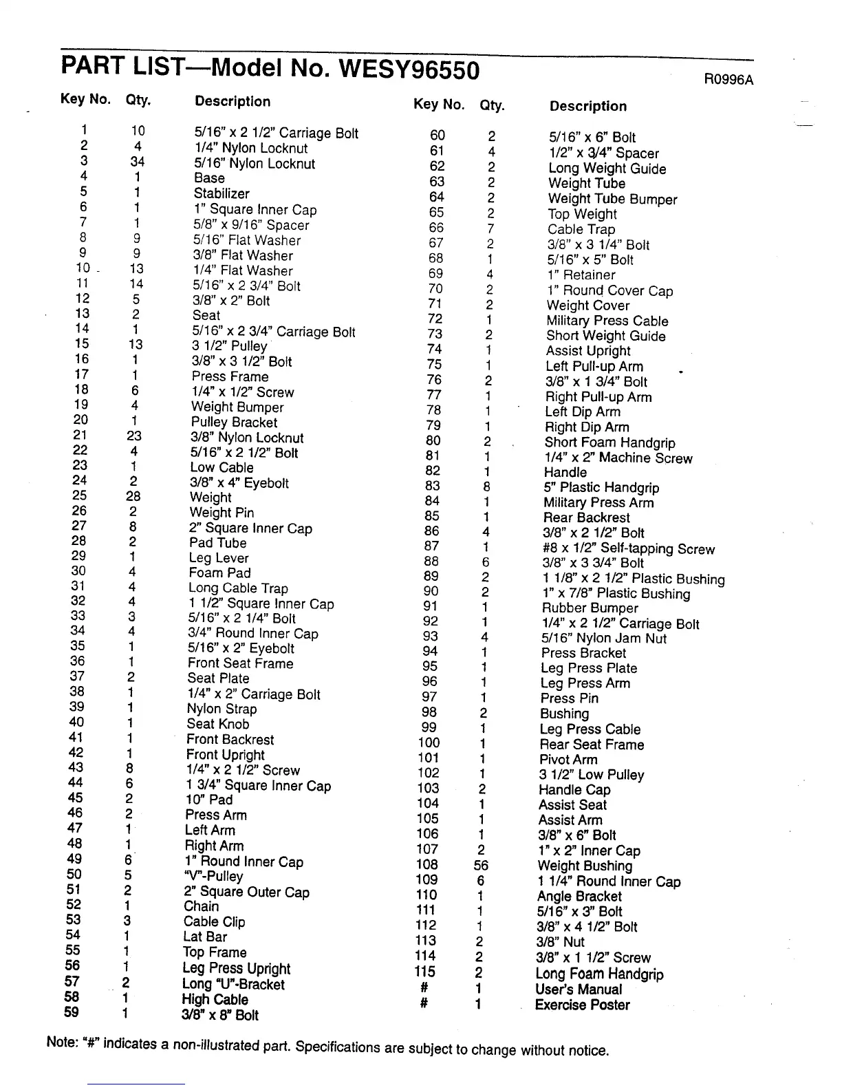 Weider Pro 9655 - Part List