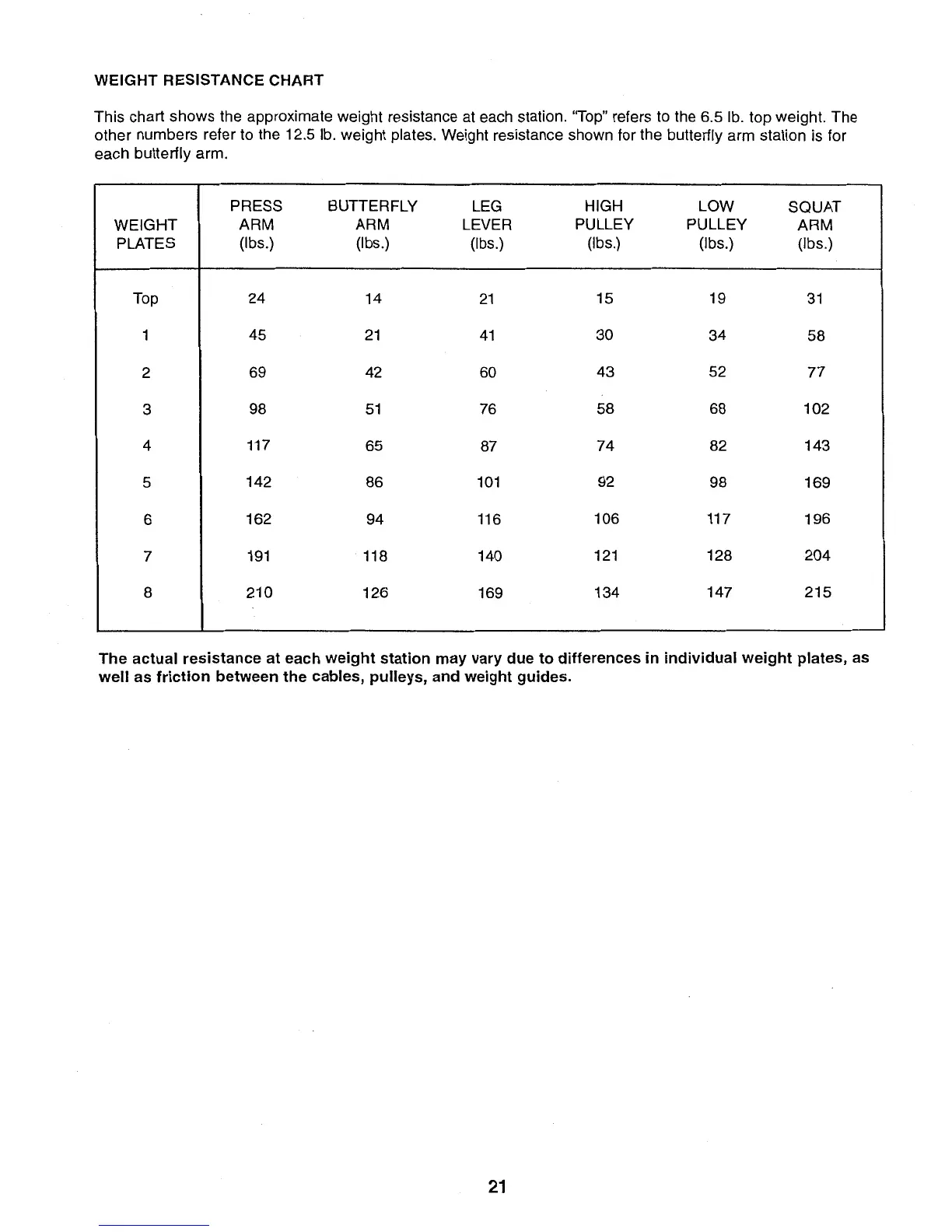 Weider Pro 9725 - Weight Resistance Chart