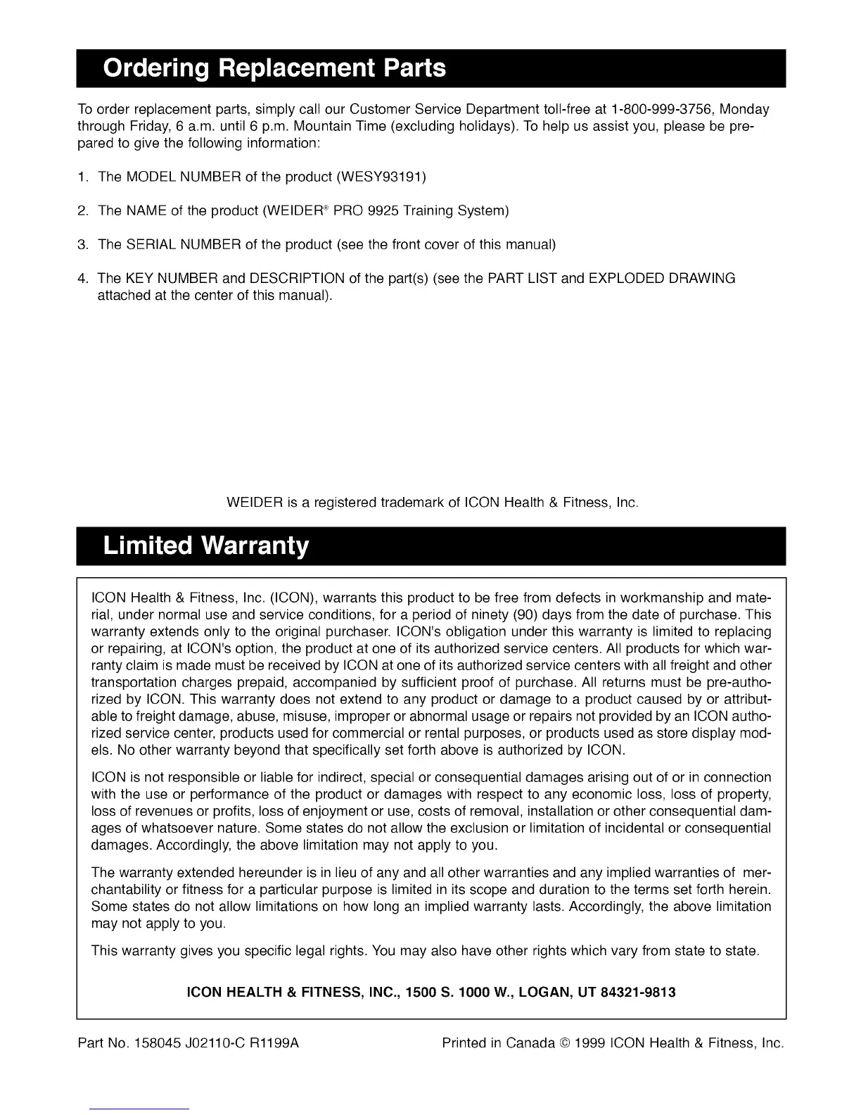 Part No. 158045 J02110-C R1199A Printed in Canada © 1999 ICON Health & Fitness, Inc.