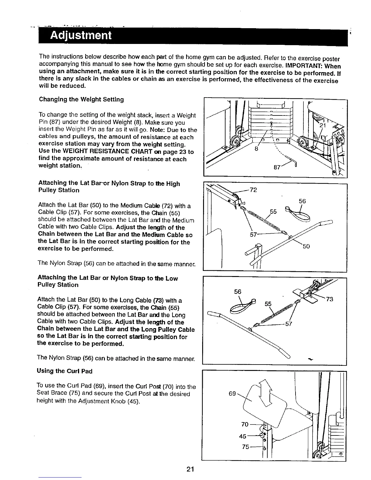 The instructions below describe how each part of the home gym can be adjusted. Refer to the exercise poster