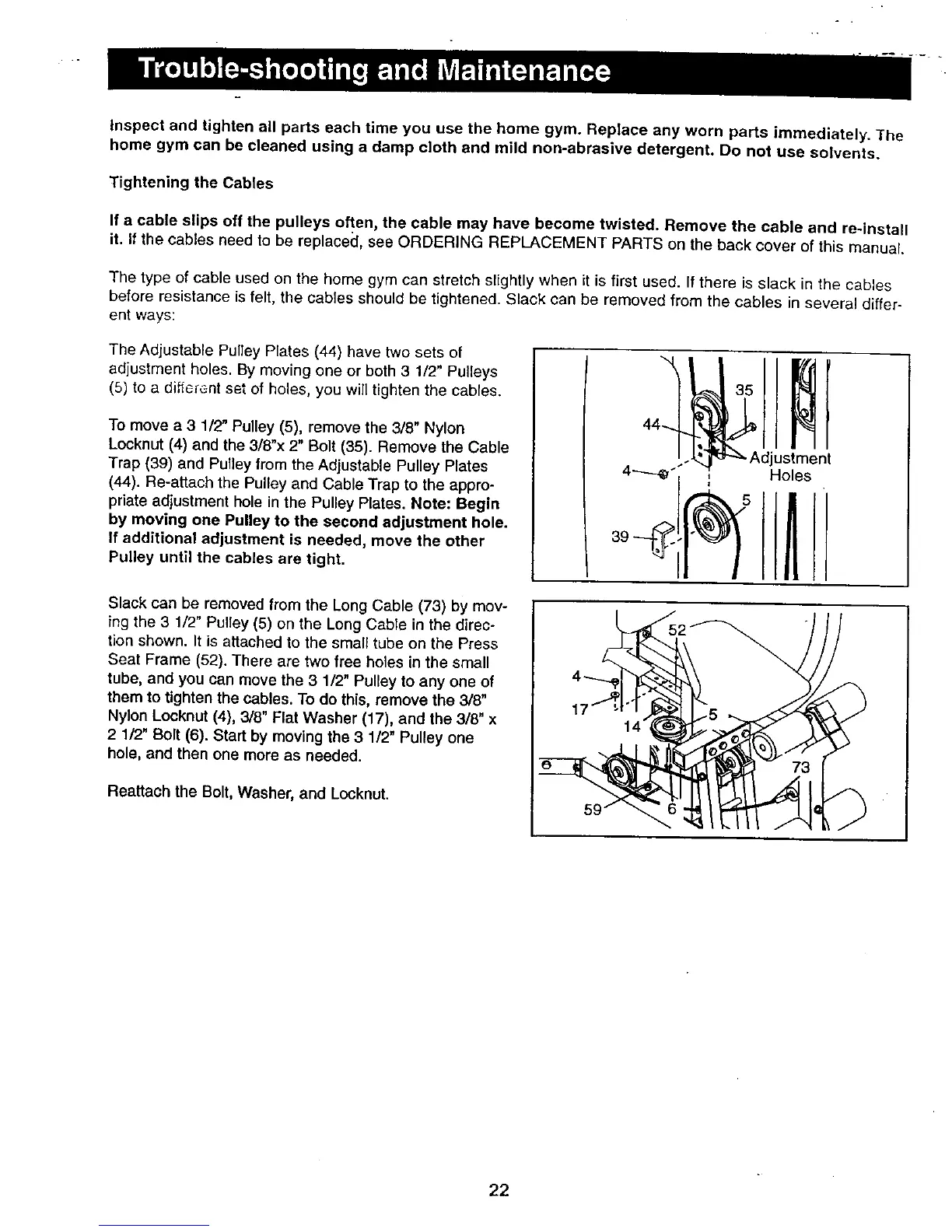 Inspect and tighten all parts each time you use the home gym. Replace any worn parts immediately. The