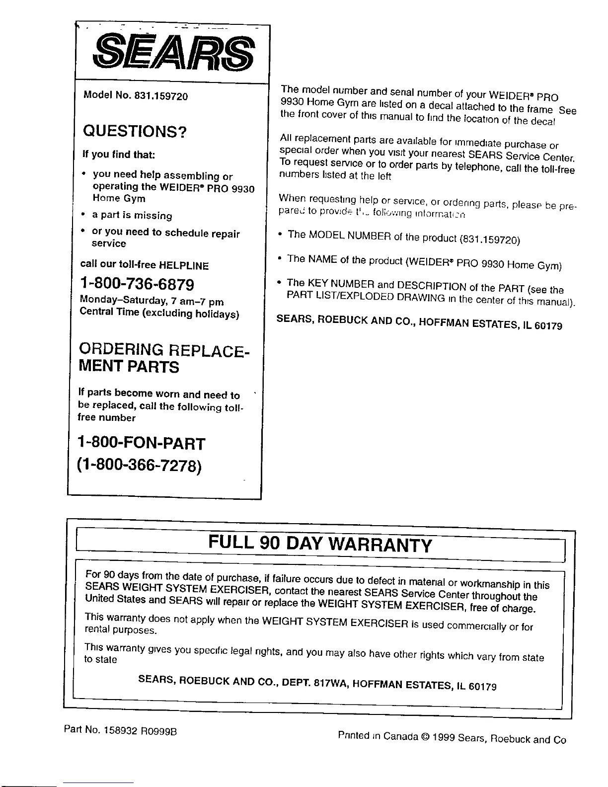 Part No. 158932 R0999B Pnnted Jn Canada © 1999 Sears, Roebuck and Co
