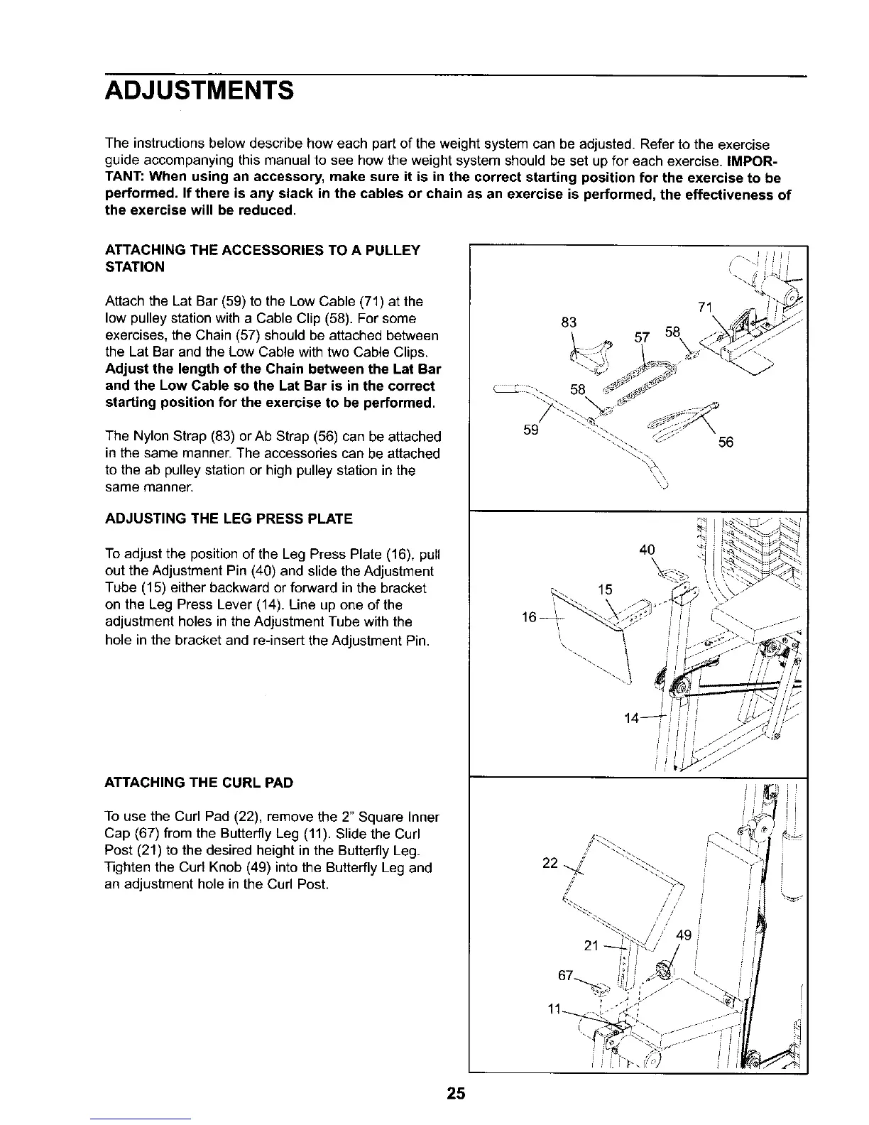 The instructionsbelow describe how each part of the weight system can be adjusted. Refer to the exercise