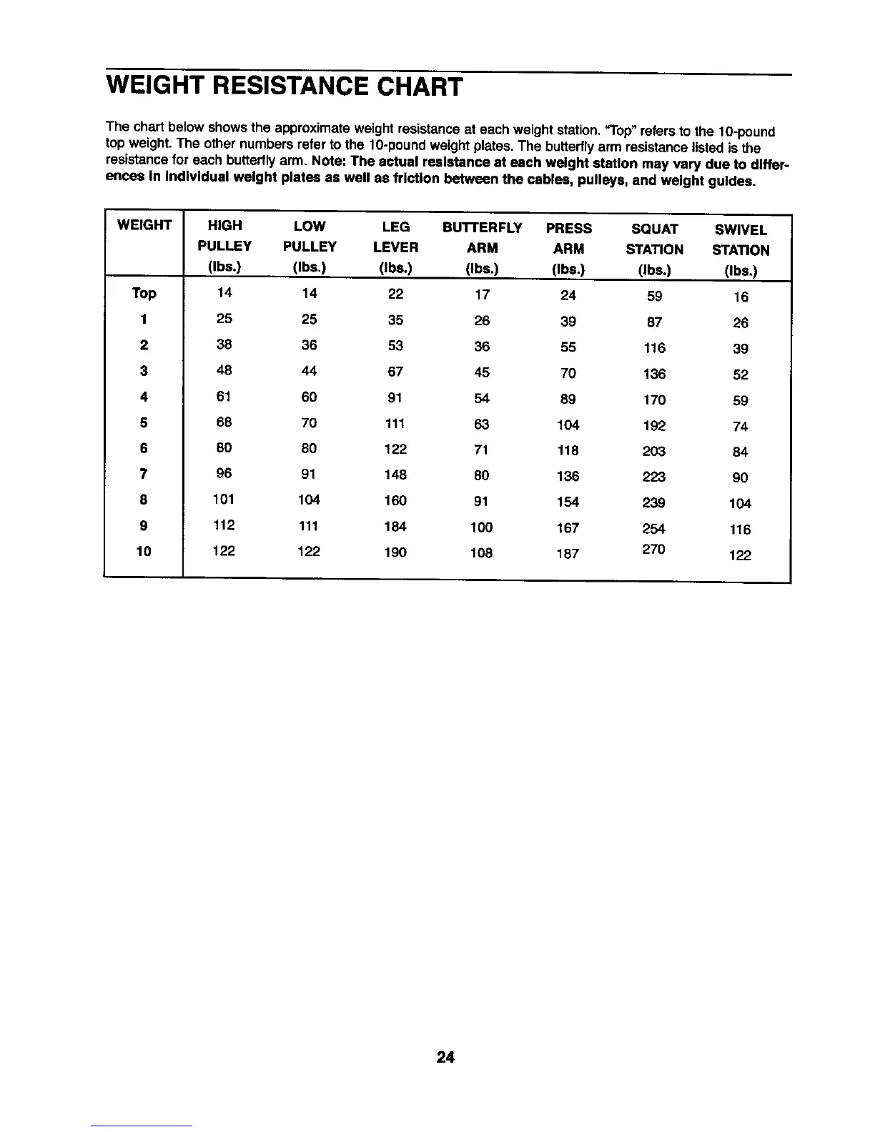 The chart below showsthe approximateweight resistanceat each weight station."Top"refers tothe 10-pound