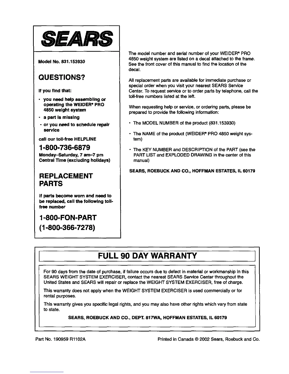 Part No 190959 R1102A Printedin Canada © 2002 Sears, Roebuckand Co