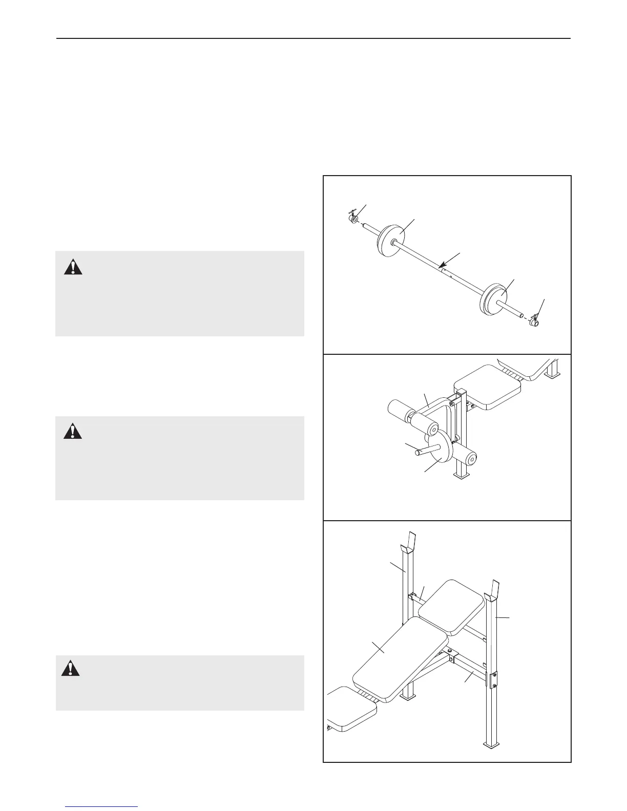 ake sure all parts are properly tightened each time the weight bench is used. Replace any worn parts immediate-