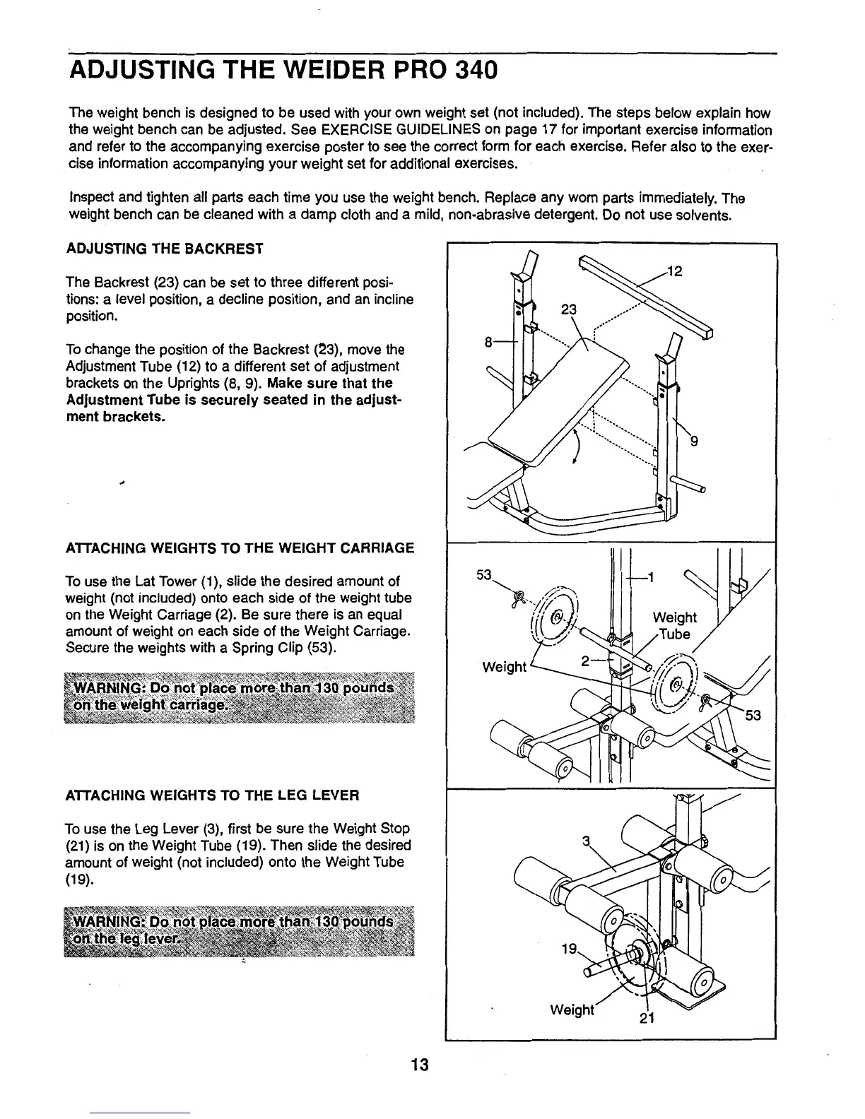 WeiderPro Pro 340 - Adjusting the Weider Pro 340; Adjusting the Backrest; Attaching Weights to Weight Carriage; Attaching Weights to Leg Lever