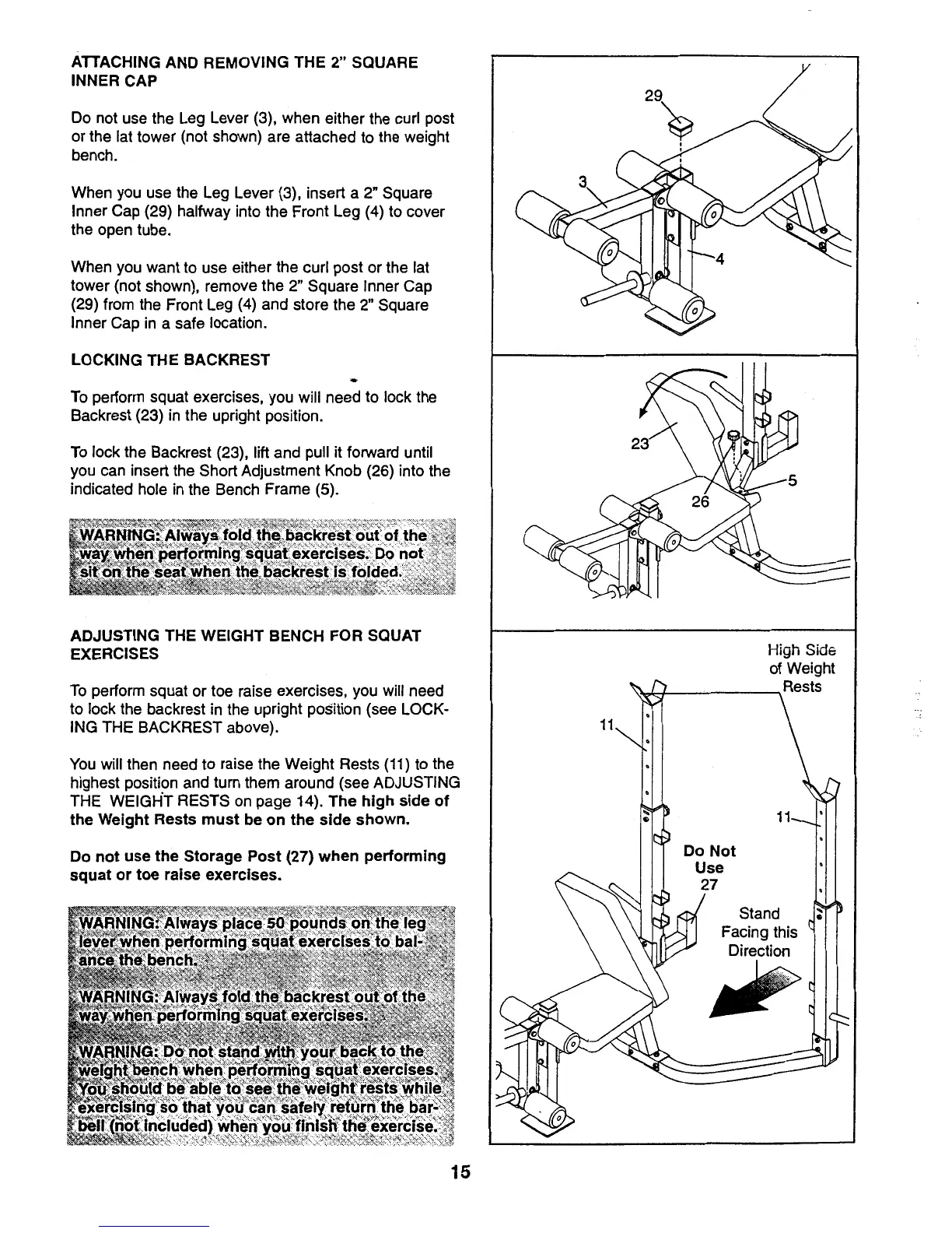 WeiderPro Pro 340 - Attaching and Removing the 2 Square Inner Cap; Locking the Backrest; Adjusting the Weight Bench for Squat Exercises