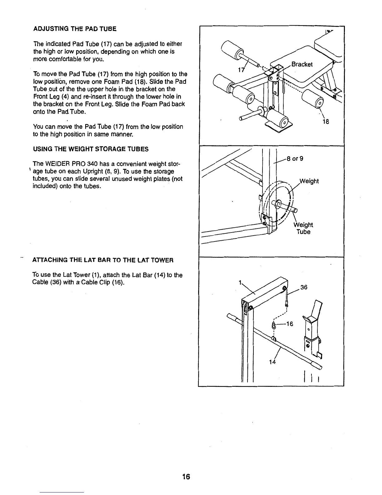 WeiderPro Pro 340 - Adjusting the Pad Tube; Using the Weight Storage Tubes; Attaching the Lat Bar to the Lat Tower