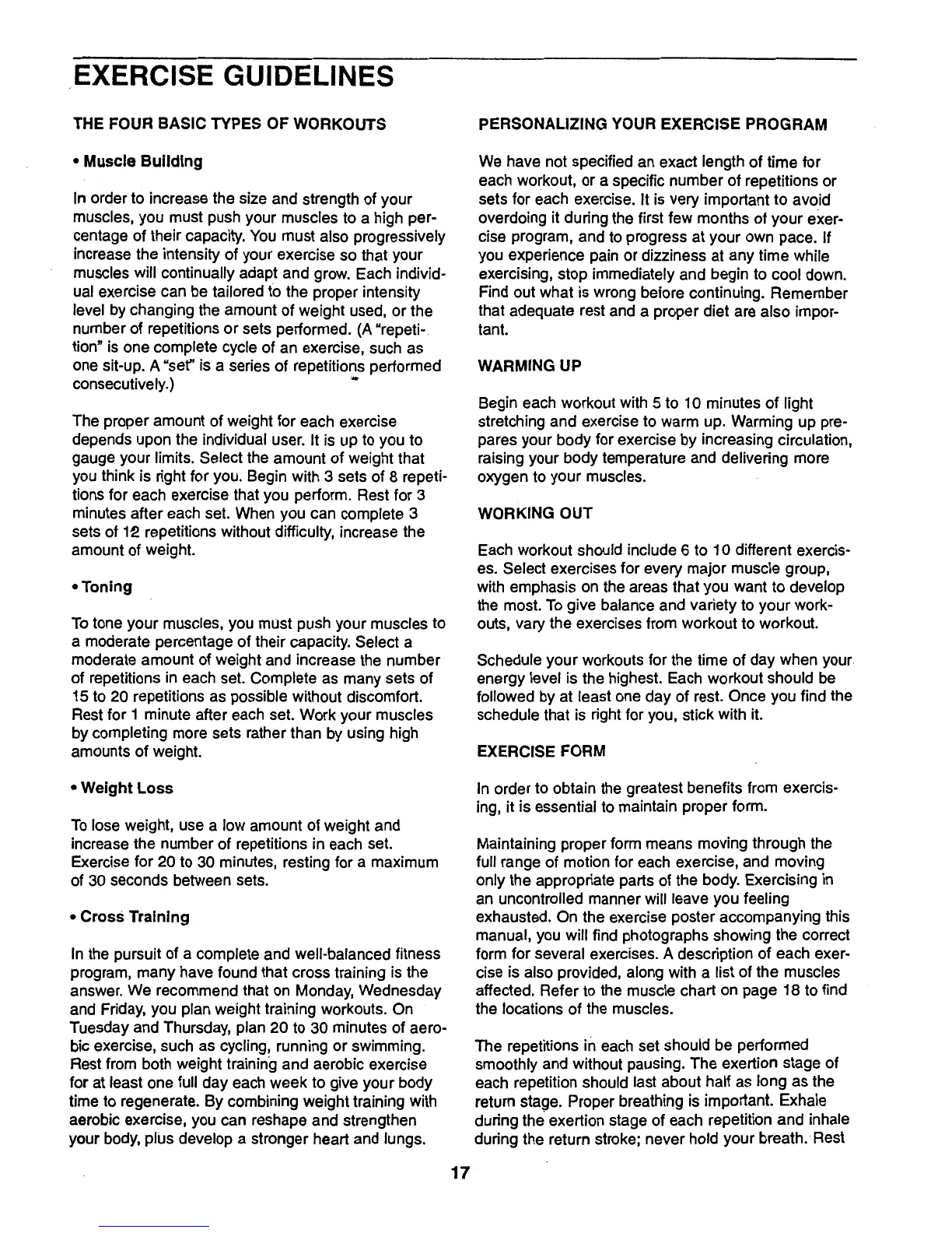 WeiderPro Pro 340 - Exercise Guidelines and Tips; Workout Types and Personalization; Warm-up, Workout, and Cool-down; Exercise Form and Breathing Techniques