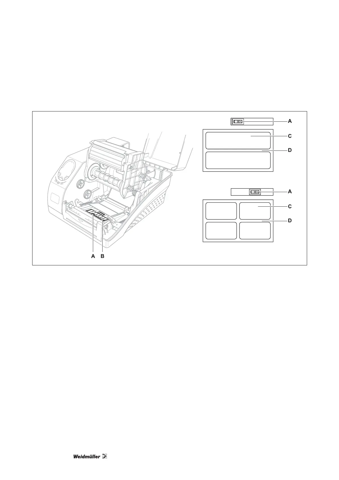 3 Posizionare il sensore etichette (A) in modo che le etichette possano muoversi centralmente al di sopra. Il