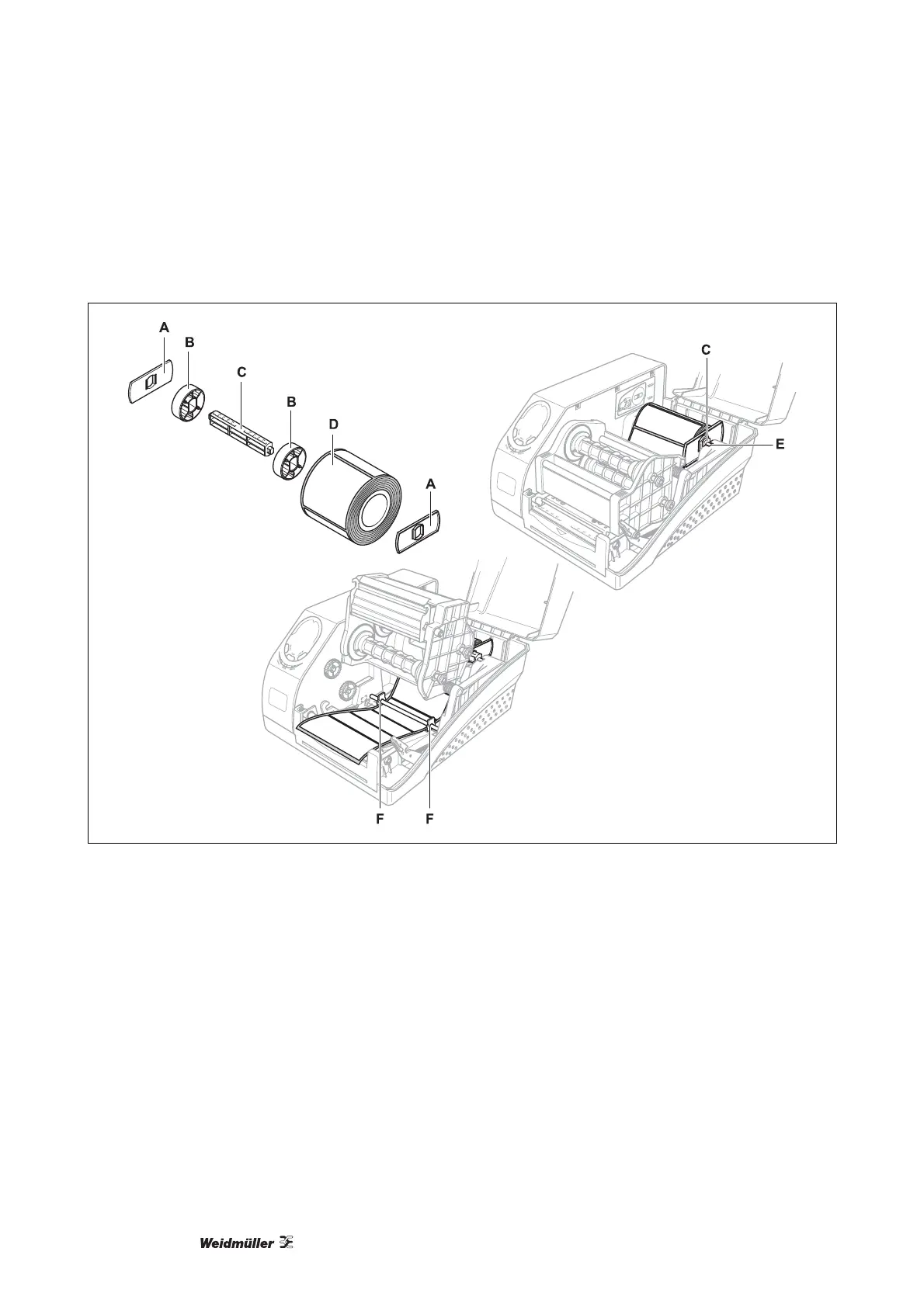 A Guías de rollos de etiquetas B Adaptador de núcleo de etiquetas